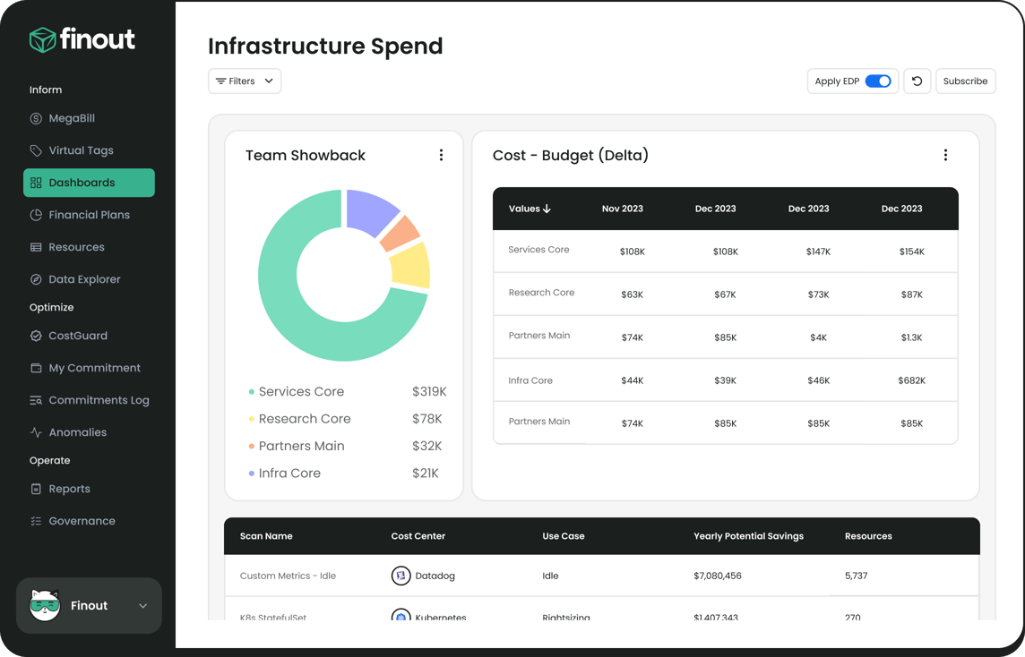 Without adding code or agent integrate your entire infrastructure cloud spend into Finout’s MegaBill and track it at any granularity, without issues of scale or complexity