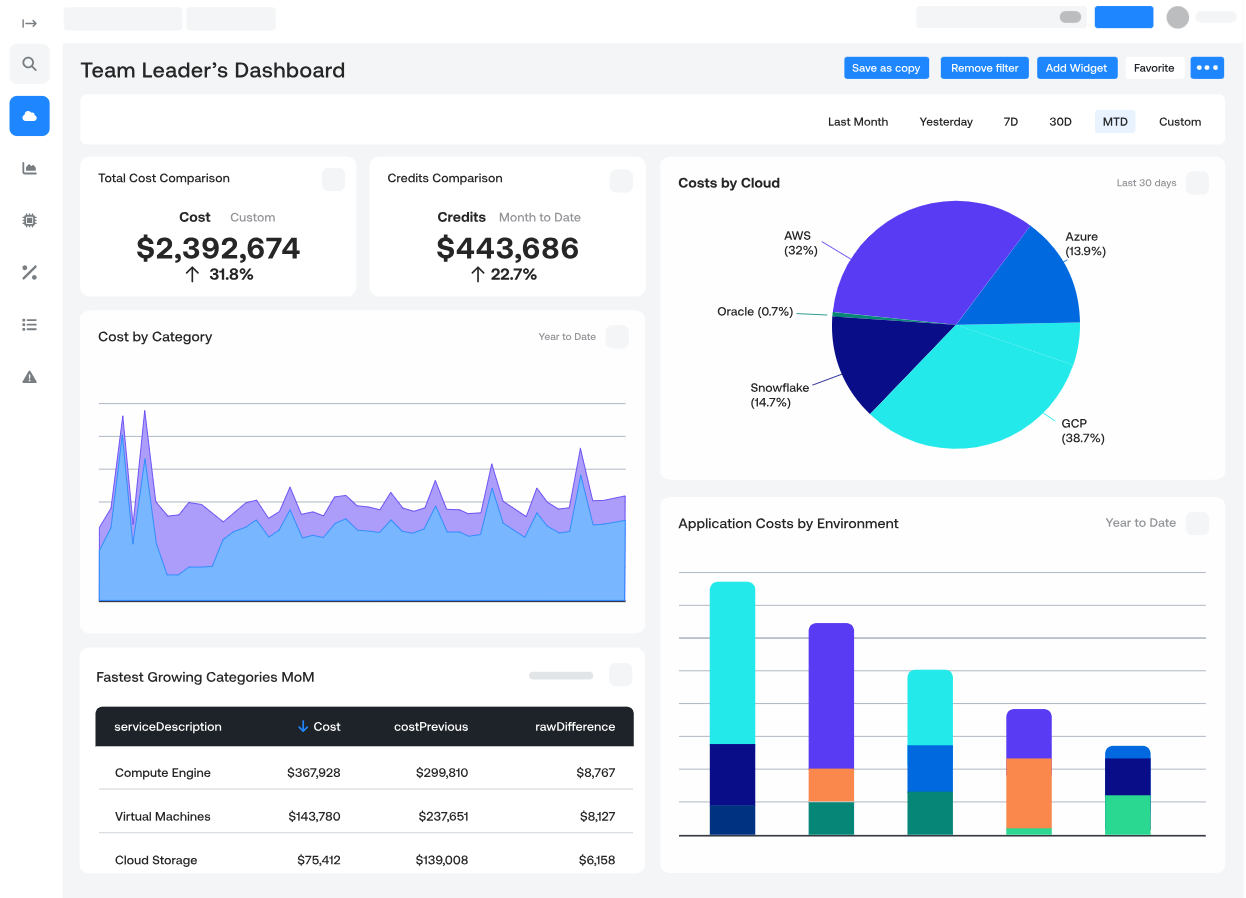 - Unit cost metrics: Tracks cost per unit (e.g., per customer or transaction) to identify inefficient workloads and target savings.