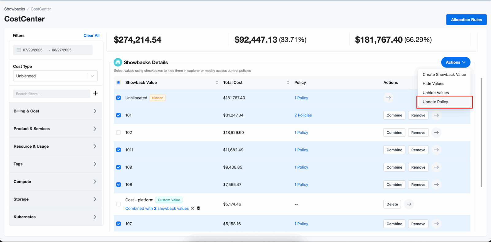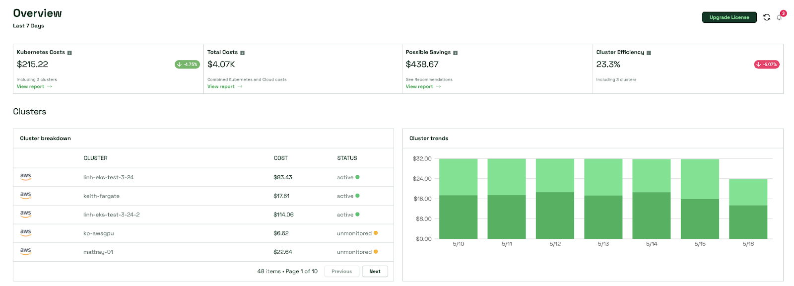 - Resource allocation coverage: Attributes costs for in-cluster resources, including CPU, GPU, memory, and persistent volumes, to expose drivers of application and team expenses.