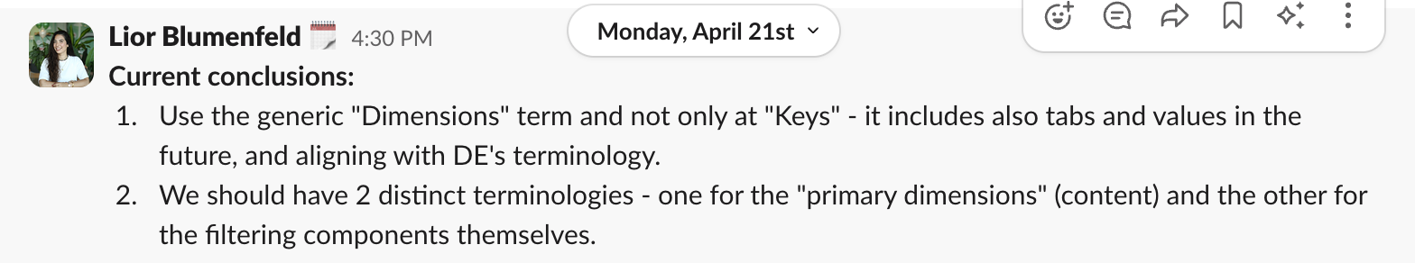The “Sets” evolution: Then came the twist. From dimensions, we got to “Sets” - groups of dimensions with a specific context that could travel anywhere in the system. That’s when the naming saga turned into weeks of back-and-forth. Me, the PMM, and our CPO in a relentless loop of brainstorms, hot takes, and “try again” moments. Eventually, out of the chaos, one name stuck: Dimension Sets.