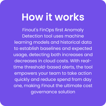 Finout’s ML-powered anomaly detection uncovers anomalies across your cloud infrastructure, increasing profitability and accountability by addressing potential issues before they impact your bottom line.